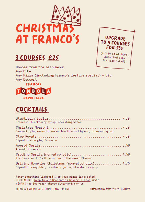 This Christmas, we’re bringing a festive Italian tradition to the table with Franco’s Tombola — a playful twist on the much-loved Italian game families enjoy during the holidays. When you dine from our Christmas menu, you’ll get the chance to take part in Franco’s Tombola and win amazing prizes to take home. It’s the perfect way to add a little extra joy (and maybe a surprise or two!) to your festive feast. Gather your friends, share our seasonal sourdough pizzas, and let the games begin — only at Franco Manca this Christmas.