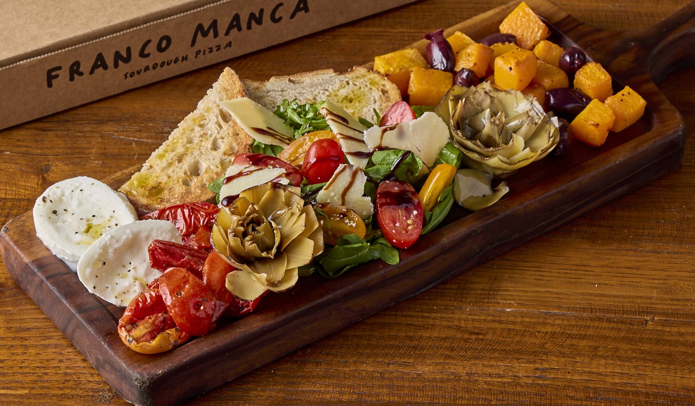 Buffalo mozzarella, grilled artichoke, butternut squash, Kalamata olives, baby plum & semi-dried tomatoes, Franco's Grana, sourdough bread