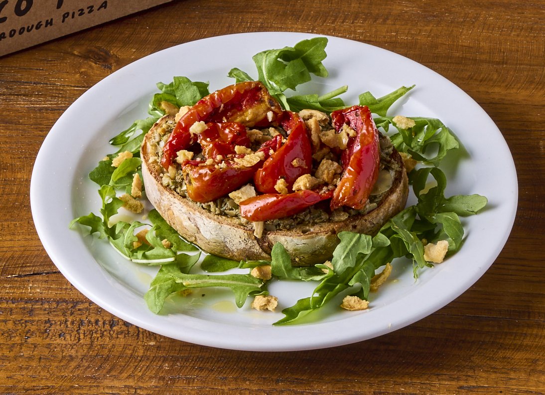 Artichoke pâté bruschetta, semi-dried tomatoes, crushed tarallini