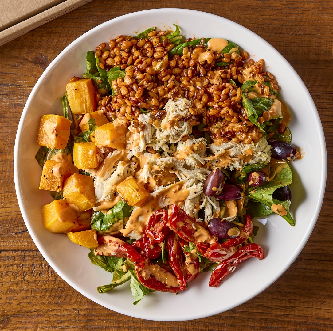 Marinated chicken (H), butternut squash, mixed grains, semi-dried tomatoes, Kalamata olives, spinach, rocket, Calabrian pepper dressing