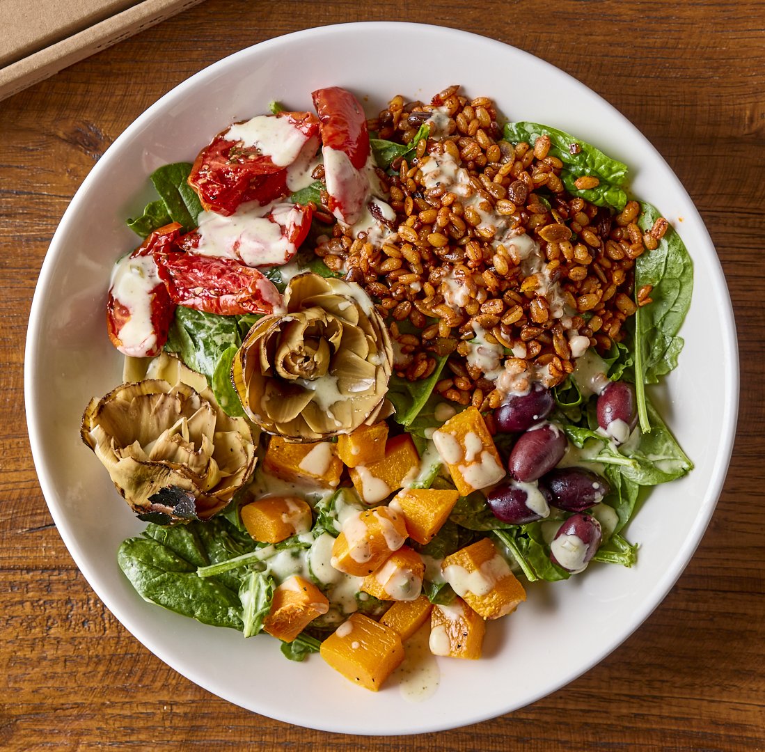 Roasted artichokes, butternut squash, mixed grains, semi-dried tomatoes, Kalamata olives, spinach, rocket, green goddess dressing