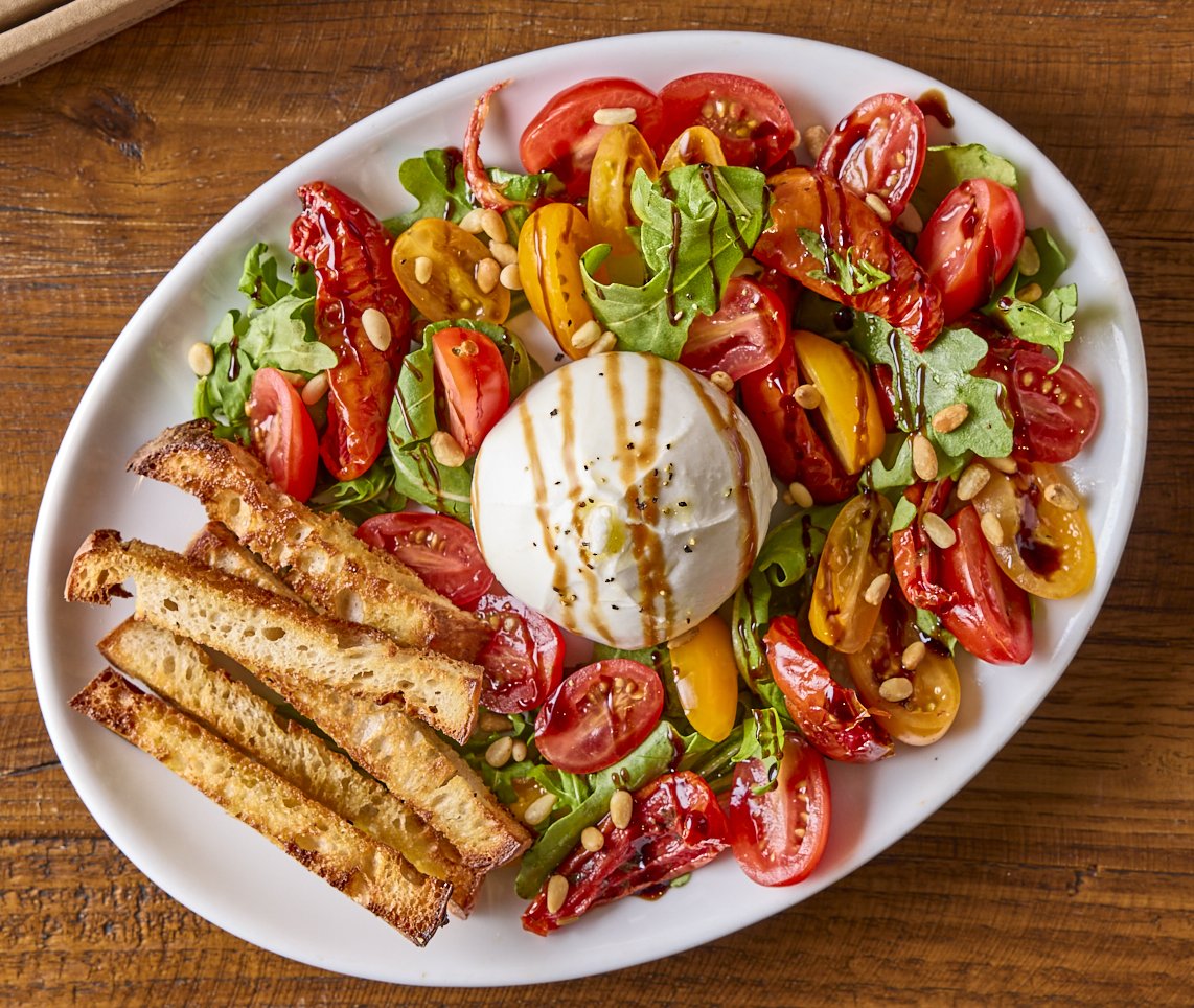 Burrata, baby plum & semi-dried tomatoes, rocket, toasted pine kernels & balsamic glaze w/ charred sourdough