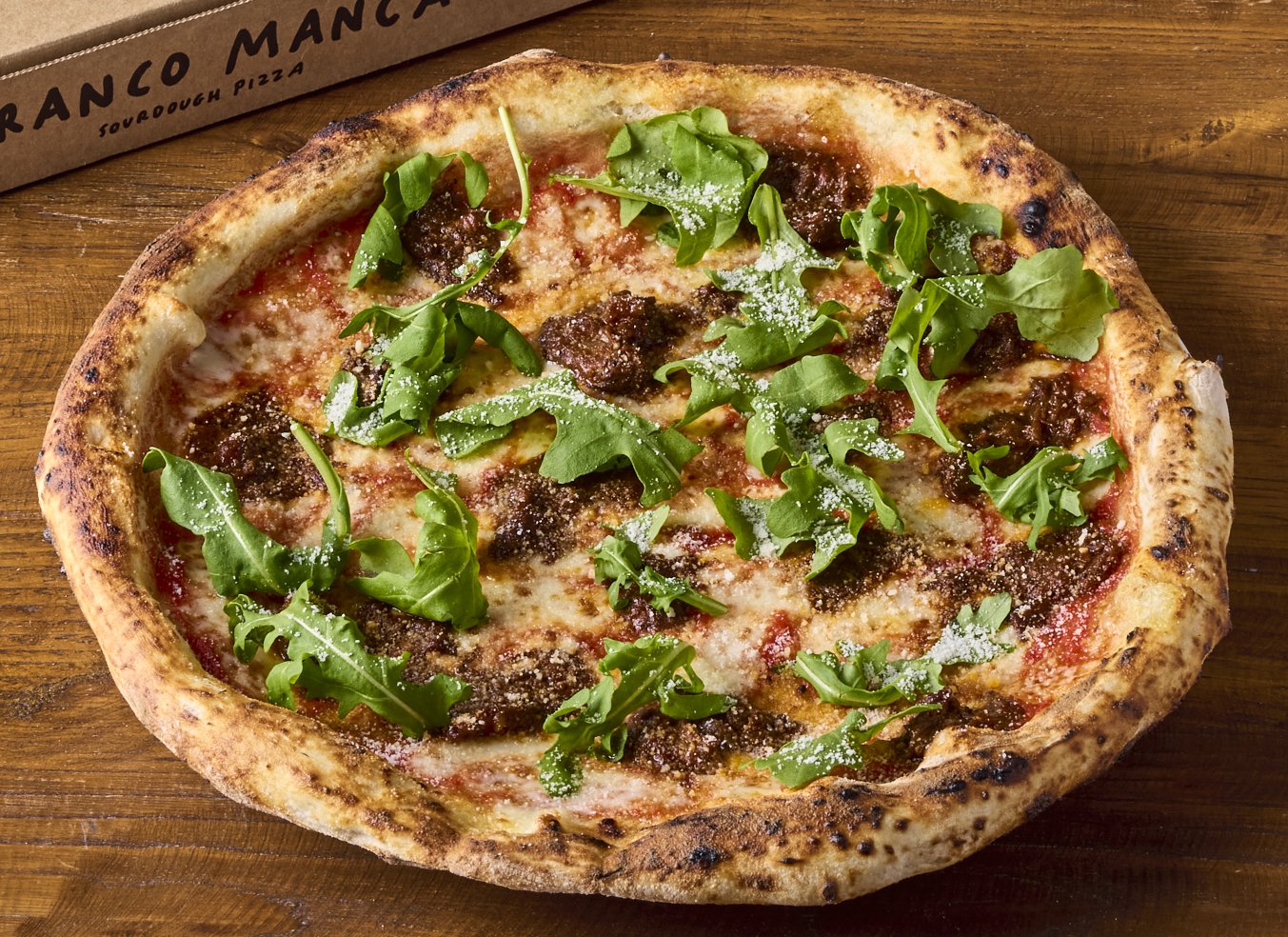 Neapolitan beef shin ragú, organic tomato, mozzarella, Franco's Grana, pecorino Romano D.O.P, rocket