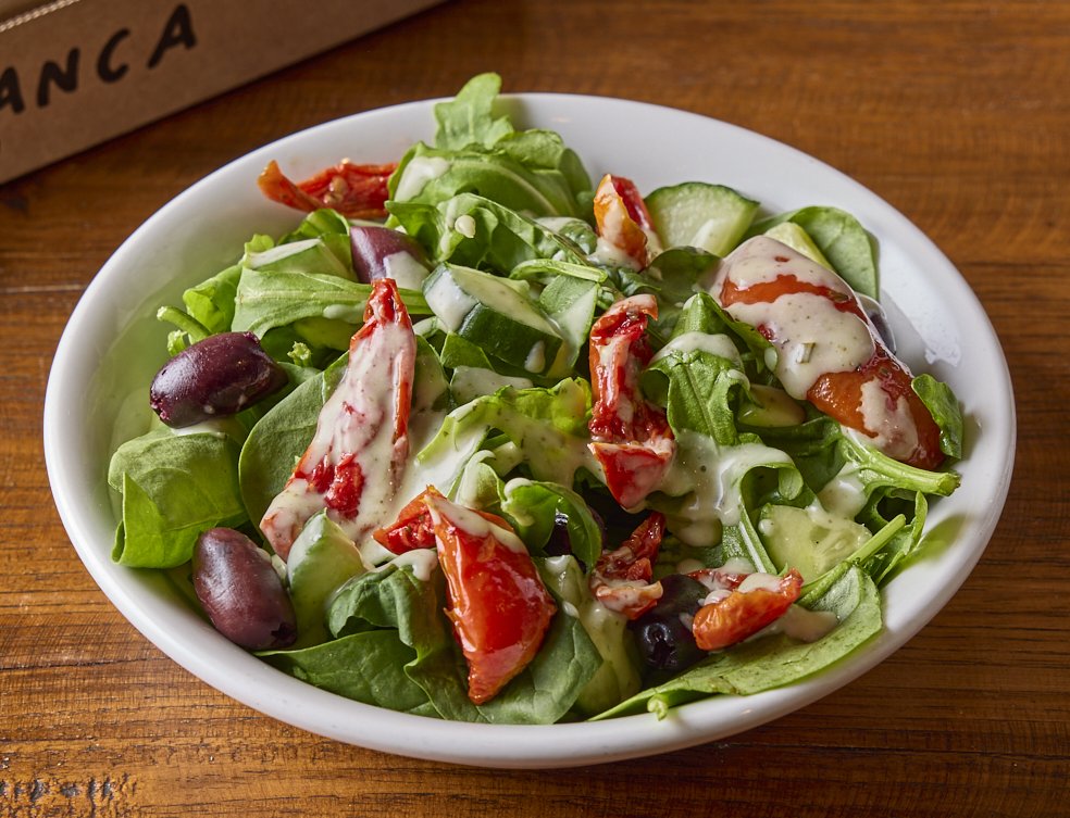 Mixed leaves, semi-dried tomatoes, Kalamata olives, cucumber, green goddess dressing