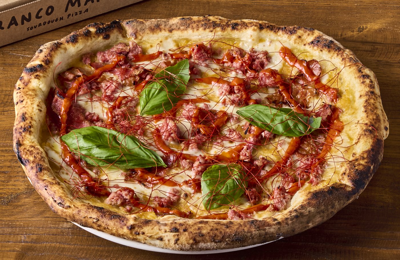 Yellow tomato base, mozzarella, Tuscan sausage, crispy pancetta, hot honey & 'nduja sauce, basil, chilli threads