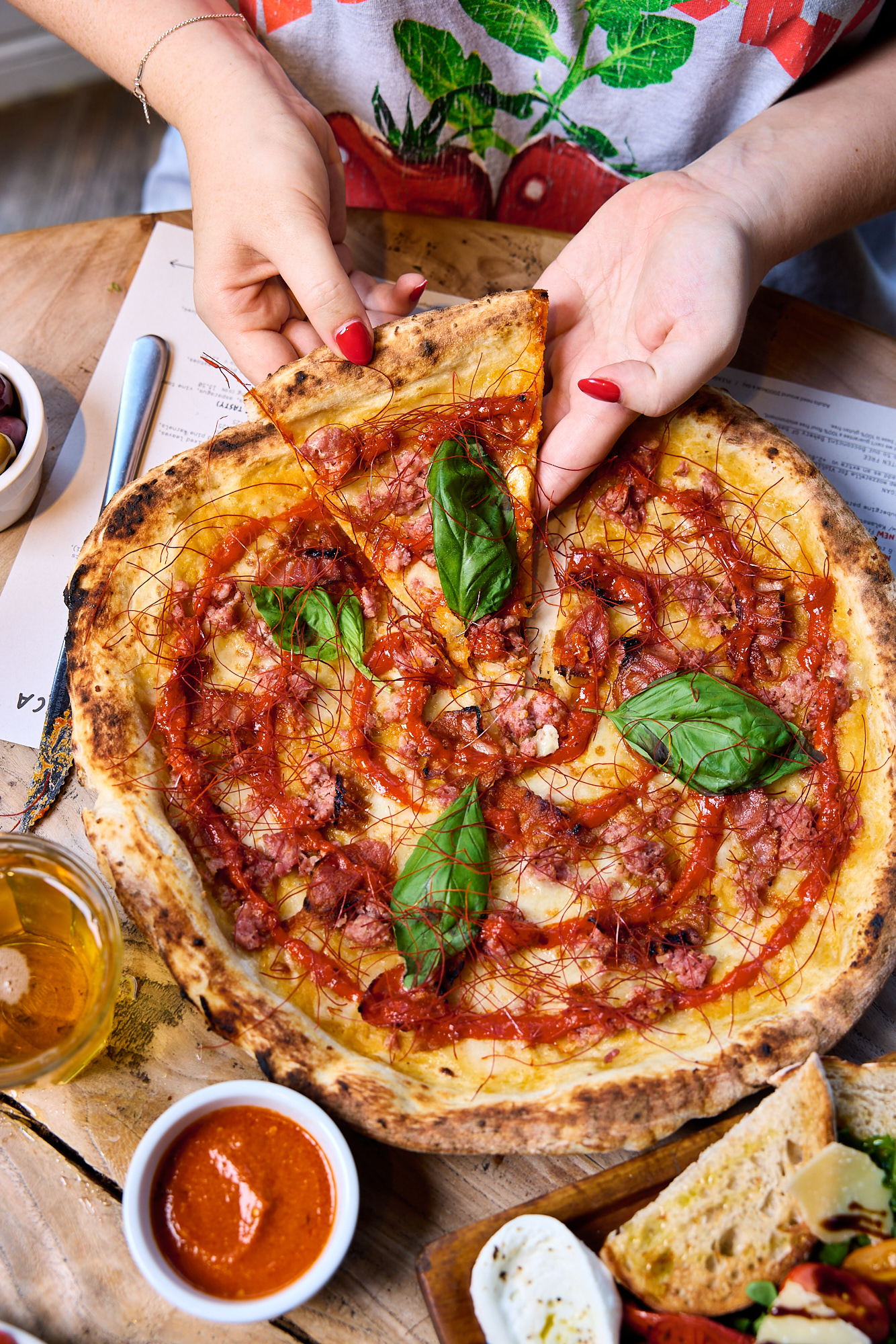 Yellow tomato base, mozzarella, Tuscan sausage, crispy pancetta, hot honey & 'nduja sauce, basil, chilli threads